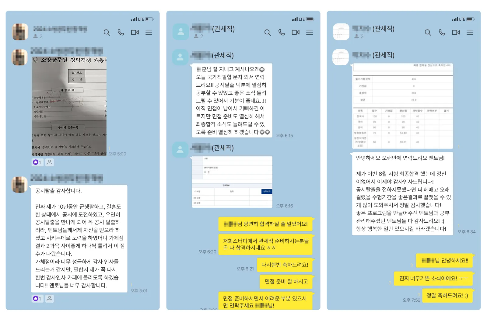 “ 저는 공시탈출을 경험하면서 제 수험생활 중 가장 열심히 복습을 해봤던 것 같아요. 그 점이 큰 변화였습니다. 그리고,, 아홉시 반이면 집가고싶어서 홀라당 스카를 나왔던 제가.. 줌 스터디 덕분에 열시 반까지 앉아 공부를 합니다... 감사해요” - 합격생 유0령-