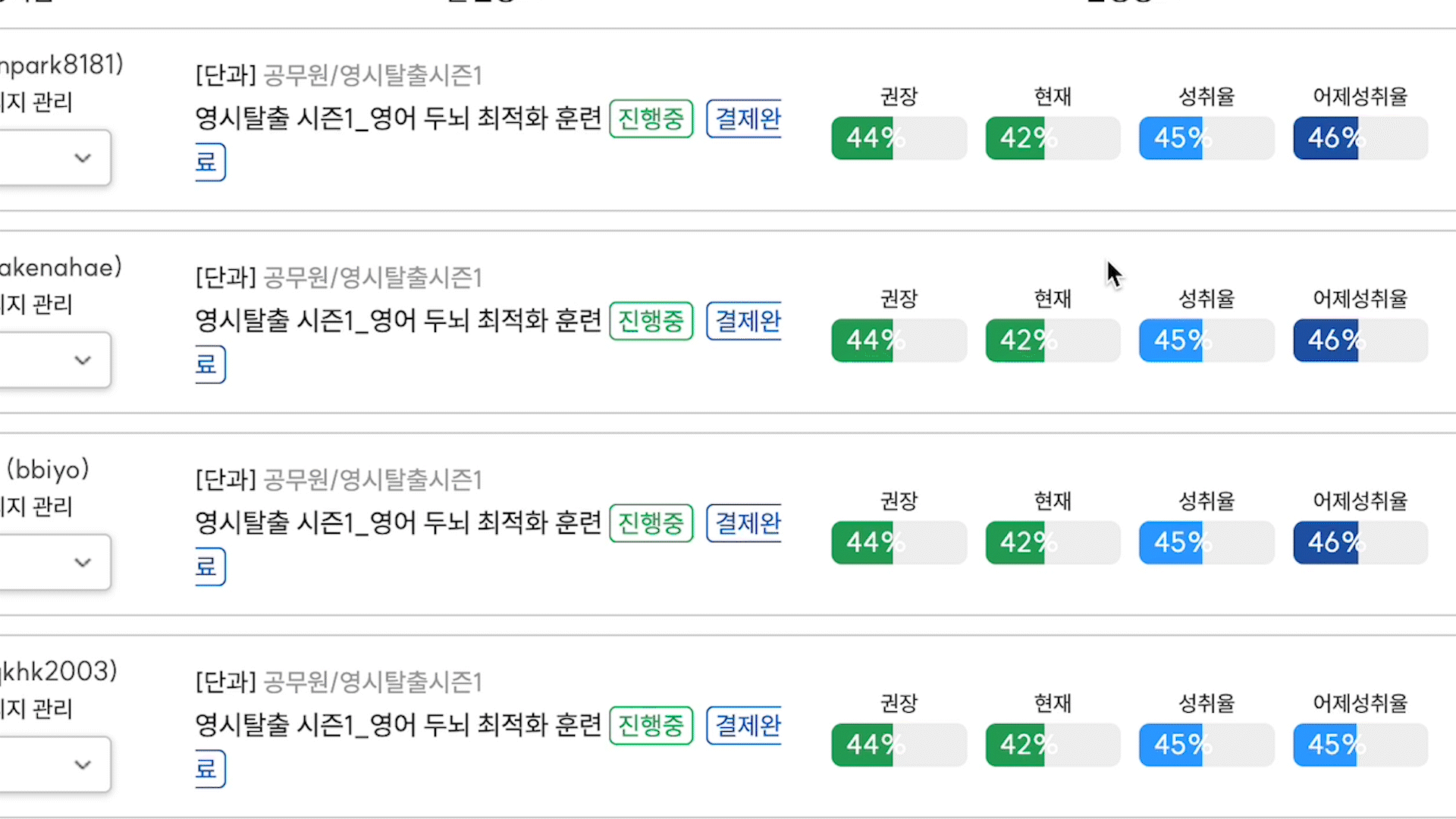 진도 달성률이 60% 이하로 떨어지면 다음 컨설팅 수강을 엄격하게 제한 합니다.