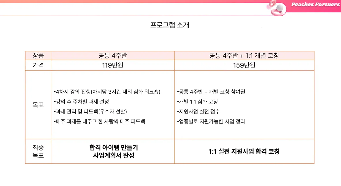 (54:46) 왜? 사업객 잘 쓰는 사람은 이제는 필요 없다니깐요. 예. 지원 사업을 아는 사람이 필요한 겁니다. 이제는. 자, 그래서 여러분들을 위해서 이제 이번에 3기 과정은 조금 더 제가 개편을 해서 기존과 다르게 어 조금 더 심화 과정을 좀 만들었어. 그래서 단순히 이제 사업 계획서뿐만이 아니고 일대일 실정 코칭 프로그램을 통해서 여러분들이 갖고 있는 정말 합격할 수 있는 아이템을 끌어내는 그런 프로그램을 좀 준비를 했습니다. 그래서 어 사주 강의에 대한 부분을 어 보시는 분들은 이렇게 119만 원에 4차시에 시간당 한 3세시간 정도의 심화 교육을 통해서 수업이 끝나면 사업객의 아이템이 만들어지는 거예요.