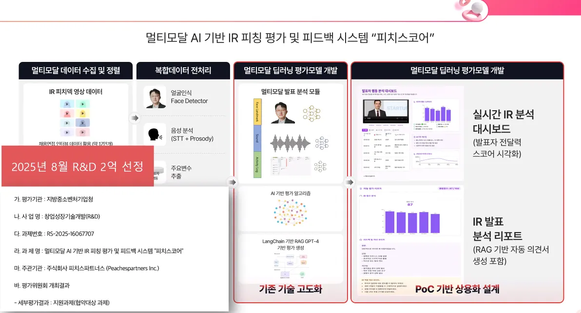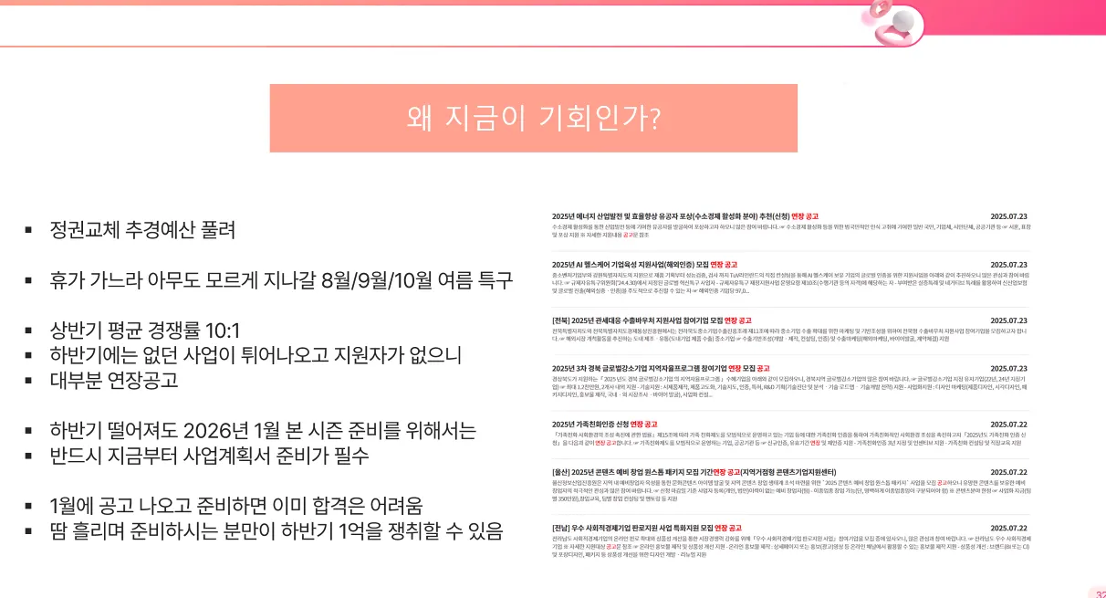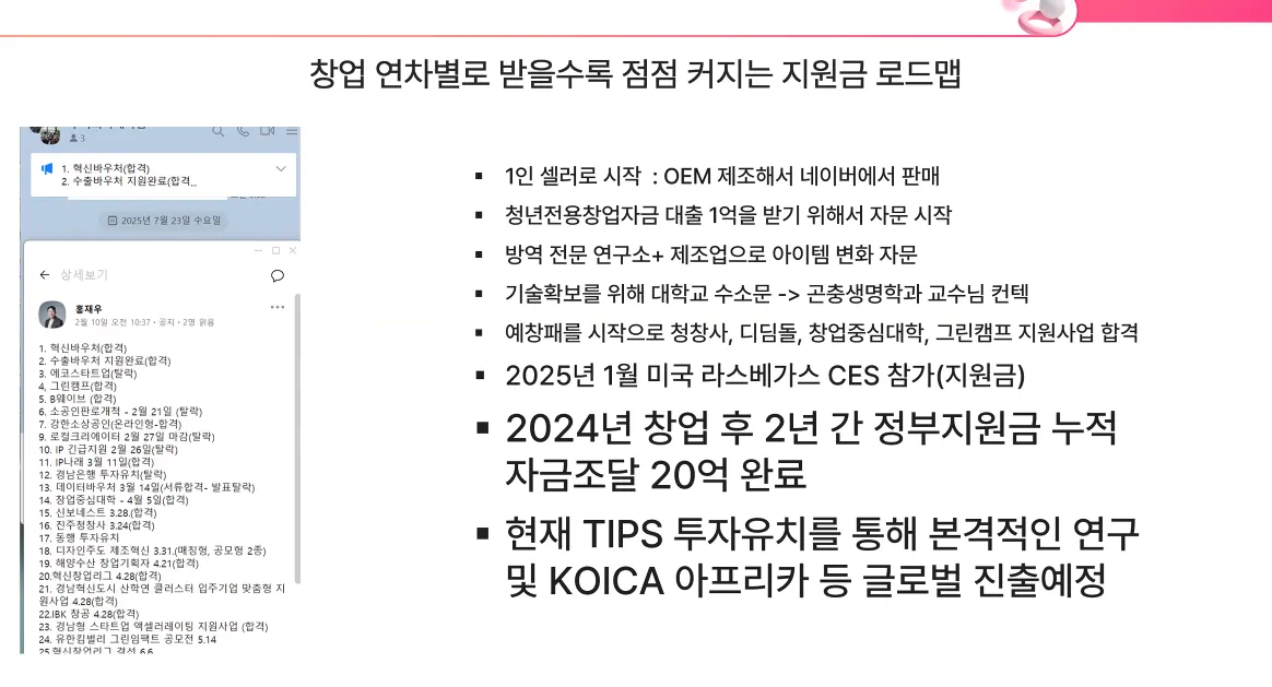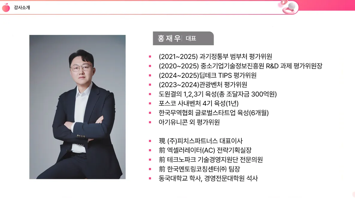 (24:31) 그래서 제가 올해 8월 달에 2억짜리 R&D에 선정이 됐습니다. 네. 그래서 이렇게 자랑스럽게 제 아이템을 여러분들에게 공개 드리는데 저는 멀티모델 AI 기반의 IR 이제 발표 자료에 대한 평가 피니백 시스템을 가지고 네. 정부 R&D에 선정이 돼서 또 요걸 제가 진행하게 됐습니다. 그래서 지원 사업에 대해서 여러분들이 모르시는 분들이 좀 뭐 가장 많이 갖고 있는 오해가 뭐냐면 뭔가 받는 사람이 따로 있다. 나는 안 될 것이다. 이런 생각을 많이 하세요. 어 나는 안 될 것이다라고 하는데 사실 합격한 분들 보면 대학생들 되게 많으시고요. 직장을 다니시는 분들도 많이 합격하세요.