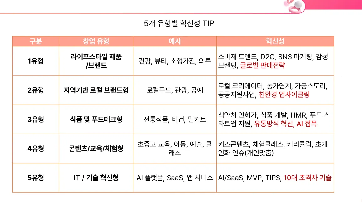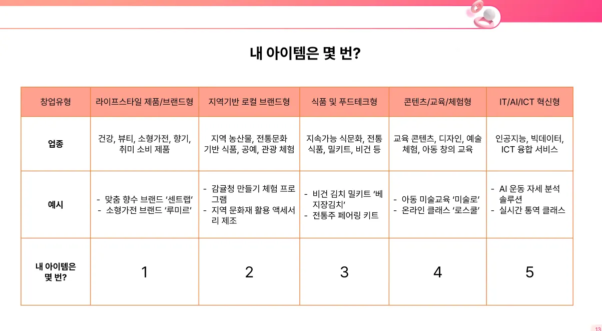 (14:00) 그죠? 감귤 초콜릿이라든지 이런 것들을 준비하시는 분들 또 액세서리 같은 것도 괜찮고요. 공해 같은 그런 것들 하시는 분들 2번. 자, 그리고 식품. 네. 먹는 거죠. 어, 먹는 건데 그냥 단순히 식당을 한다. 그런 것도 되겠지만은 그거를 포장을 해서 그저 밀키트로 만들어서 내가 유통을 하겠다. 이런 것들도 충분히 가능하고 요즘에는 많이 하는게 또 뭐가 있냐면 막걸리 그죠? 전통주 많이 하시잖아요. 그래서 지역에 뭐 구루잉이라든지 페어링 할 수 있는 여러 가지 뭐 어 안주 같은 것도 괜찮고 그런 것도 식품 관련된 어 해당이 되시겠죠. 그다음에 어 내가 아이들 교육을 하고 계신다 그러면 콘텐츠 뭐 수능이라 수능이나 뭐 아동 교육 학원을 하시는 분들도 계실 것 같고 미술학원 음악 교육 다양하게 교육을 하시는 체험하시는 분들은 4번 그리고 그 외에 뭐 AI나 이런 테크 기반의 기술을 활용하는 정보 통신이라든지 이런 것들을 어 추구하시는 분들은 5번으로 물론 1 2 3 4번도 기술이 들어갈 수 있겠지만 시장에 대한 어 산업별 트렌드를 봤을 때 나눠서 한번 답변