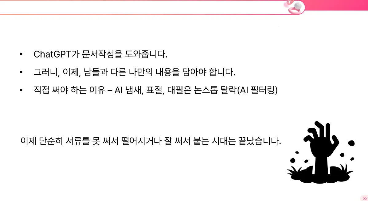(53:02) 그냥 알아서 써 주잖아요. 그죠? 어 그렇기 때문에 너무나 좋은 시절이 왔고 이렇게 프롬포트를 가지고네 반려동물 동번 프롬포트를 가지고 사회에서 써줘 하면 쫙 써 주죠. 네이 벌어졌을까? 여러분 엄청나게 지원 사업이 많아졌서를 써서 쓰기 쉬워졌다 보니까 더 많은 지원자들이 생긴 거죠. 그래서 지금 경쟁이 더 치열해진 이유가 또 이것 때문이기도 하죠. 자, 그러면 불합격하는 사업 계획서의 특징이 뭐냐면 어, 이런 내용들임이라고 볼 수 있을 것 같아요. 뭔가 내용이 채치T로 쓴 거 같은 내용인 거죠. 여러분 뭔지 아시겠죠? 네. 뭔가 화려하고 구체적이고 그렇지만 내용에 인간미가 없는 거죠.