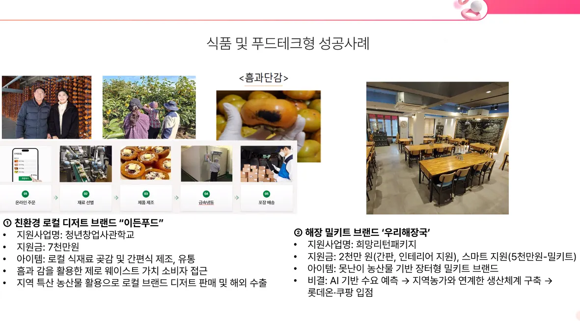 (50:22) 자, 이분 같은 경우에는 아버님이 고향에서 이제 단갑 그 감농장을 하시는 거예요. 근데 이제 거기서 아이디어를 받아서 이제 떨어진 낮과 흠과 단감을 가지고 꽃감 꽃감 있죠. 꽃감을 가지고 거기에 이제 뭐 치즈도 넣고 이래 가지고 와인이랑 같이 마시는 먹는 안주 같은 걸 해서 어 부산에 있는 청년 창업 사관학교께 합격하셨어요. 그리고 그 외에 다른 강한 소상공인도 지금 이제 지원하시고 굉장히 성장하고 있다. 그리고 해장국 하시는 분들인데 아버지 때부터 대를이어서 하시는 해장국집 아들이 아버지는 지원금을 한 푼도 못 받아봤겠죠. 근데 이것도 되나요? 하길래 어 이것도 충분히 가능합니다라고 해서 밀키트를 가지고 이것도 어 간판 지원 사업이 인테리어 같은 것도 지원을 받으셨고 밀키트를 하기 위한 포장지 진공 포장기 이런 것들도 지원금을 가지고 사업을 잘 하고 계세요.