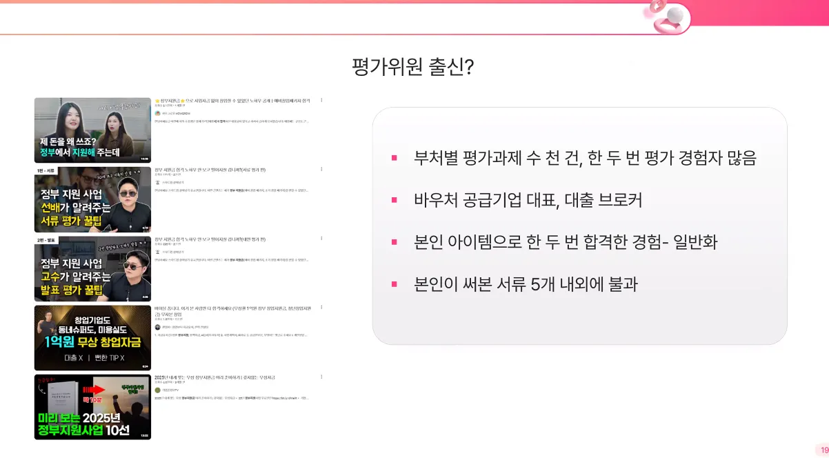 (22:06) 그래서 어 많은 분들이 평가 위원에 다녀오실 수는 있지만 대부분 조금 조심스러운 거는 한두 번 평가를 갔다고 해서 사실 과제를 알알 아는 건 아니거든요. 여러분들이 모든 산업에 대한 분야를 다 아실 수가 없듯이 그런 분들이 있고 또 알고 보면 그냥 이런 정부 바우처의 공급 기업을 운영하시면서 어 이런 거를 믿기로 해서 바우처 공급을 좀 수요 기업을 찾으려고 하는 분들이 이런 걸 많이 하시는 거 같고요. 또 대출과 관련된 브로커나 또 한두 번 합격한 자기 경험을 가지고 그걸 일반화해서 하시는 분들이 또 많이 계시는 거 같아요. 평가 이원은 대학 교수님들도 가시고 또 경영 지도사나 뭐 금융 투자사 임직원이나 이런 그 세무사 변리사 이런 전문직들이 많이 하시는데 이런 분들이 사실 산업 전반에 대한 사업을 잘 아실 순 없거든요.