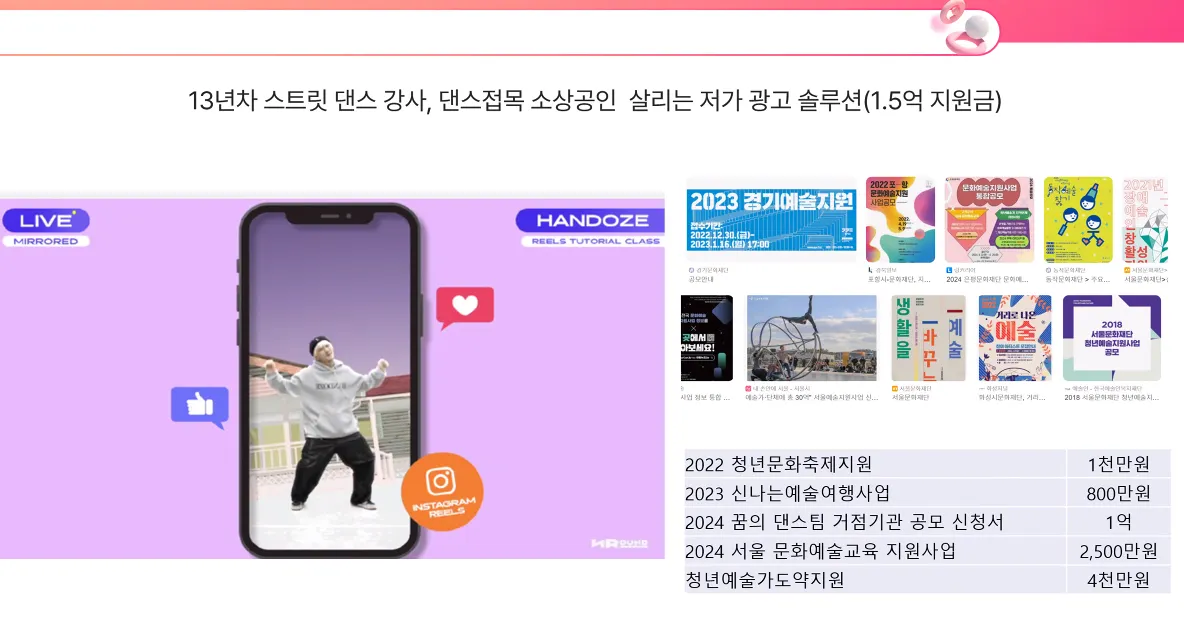 (51:49) 작년에 뭐 부산에 부산을 대표하는 청년 리더 3인 중에 한 명으로 선발돼 가지고 뭐 자기 개발비 비료 1억 원을 받으시고 뭐 그런 엄청난 성과를 내고 계시고 요즘에 뭐 수수파 댄스도 있지만 이렇게 어릴 때부터 댄스를 하시는 어 공연하시던 분들도 사실 공연 외에는 수입이 없으시잖아요. 그래서 굉장히 어 미래에 대한 불안정성이 힘드시거든요. 그런 분들도이 문화 예술과 관련된 지원 사업이 굉장히 많이 있습니다. 그걸 가지고 문화 예술 초기창 패키지가 아예 따로 있는 것처럼 그런 사업을 통해서 또 사업을 성공하신 케이스도 많이 있습니다. 자, 여러분들은 그러면 사업 계획서 혹시 써 보신 적이 있으실까요? 한번 여쭤보고 싶습니다. 네.