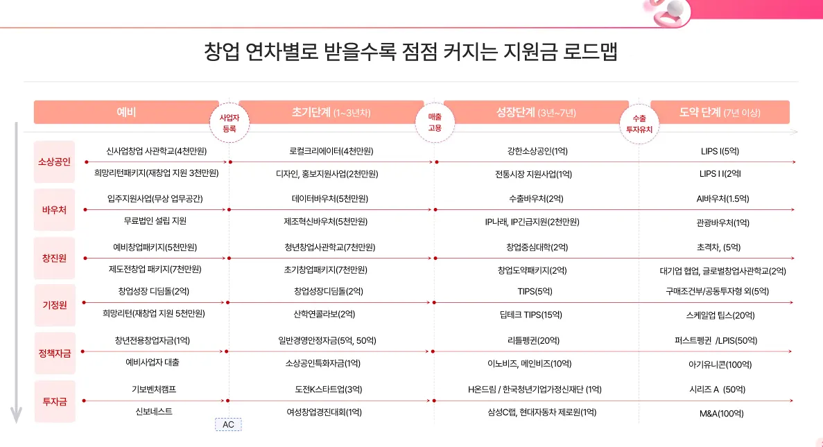 (31:03) 한번 볼까요, 여러분? 예비. 왼쪽에 제일 왼쪽 끝을 보세요. 예비. 그죠? 그다음에 뭐죠? 초기 1에서 3년 차. 요거 차이는 뭐죠? 사업자 등록증이 있느냐 없느냐에 따라서 예비해서 초기로 넘어가죠. 초기에서 3년이 지나면 뭐죠? 성장. 자, 성장 7년 차까지는 우리나라에서는 초기 창업기업을 봅니다. 7년까지는 창업 기업이기 때문에 굉장히 많은 지원사이 몰려 있어요. 자, 그리고 나서 도약. 도약은 없느냐? 도약도 많이 있죠. 아까 말한 강한 소상공인은 도약 때 받을 수 있는 지원 사업이고요. 네. 10년 차, 20년 차 기업들은 너무 오랫동안 생존했기 때문에 장소 소상공인 100년 소상공이 아니어도 국가에서 장하다고 육성해야 된다고 지원해 주는 사업도 굉장히 많이 있습니다.