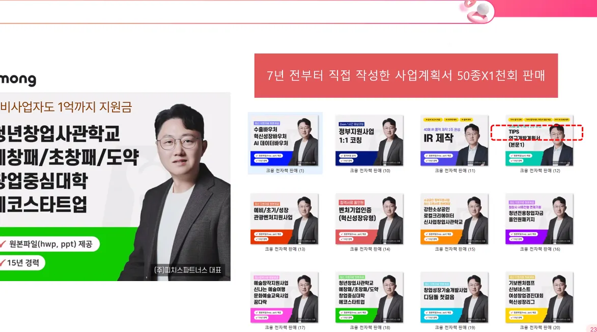 (23:52) 저는 어 정부지원 사업을 실제로 작성을 많이 했습니다. 한 2,500권 정도에 외계 보시는 것처럼 제 매장하드에 자료들을 제가 작성한 서류들이 있고 또 뭐 이제 재능 마켓에 제 자료가 50종 정도를 판매를 하고 있는데 1천권 이상이 판매가 된 어 이력이 있습니다. 그래서 굉장히 사실 시중에 다니는 많은 지원 사업들을 제가 작성을 한 서류들이라고 보시면 될 거 같고요. 또 최근에 이제 제가 조금 자랑드리고 싶은 거는 저도 정부지원 사회 합격을 했습니다. 네. 그래서 거기 평가 위원 분들도 굉장히 놀라셨는데 평가 의원이 가서 평가를 받아서 합격하는 건 굉장히 또 자기 자신을 증명한 일이라고 할 수 있을 것 같거든요.