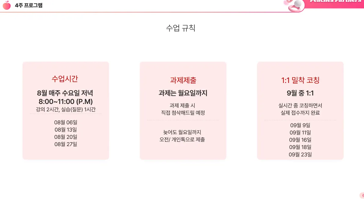 (59:11) 과제네 매주 이런 식으로 제가 과제가 나갑니다. 그래서 여러분들이요 과제만 할 수 있는 것만 써서 주시면 돼요. 네. 뭐 사업 계획 어렵게 쓰고 이런 거 제가 안 시킵니다. 여러분들의 수준을 제가 알기 때문에 요런 거 정도만 어려운 거면 또 GPT 돌려서 쓰는 법도 알려 드릴 거니깐요. 너무 어려워하지 마시고 어머니들 뭐 이렇게 50 이상 되신 시니어분들 다 걱정 안 하셔도 됩니다. 다 쓸 수 있게 제가 도와드리겠습니다. 네. 그래서 일단 수업만 열심히 참여만 하시고 따라만 오시면 사업 무조건 나올 수 있게 네. 제가 도와드릴 거니깐요. 걱정하지 마시고 들어오시면 될 거 같고 수업은 일단 매주 8월 달, 매주 수요일 날 저녁에 여러분들 편하신 시간에 8시부터 11시요 시간대 할 거고요.