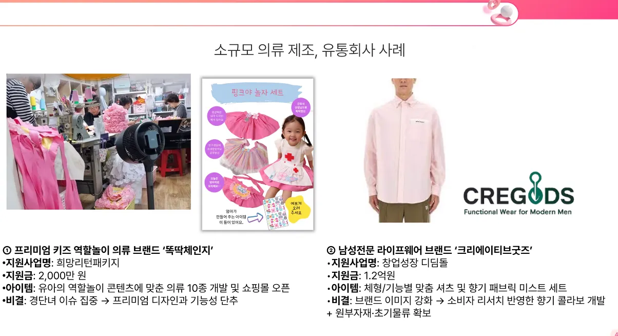 (49:39) 그리고 어 낚시 브랜드 하시는 분 이분 같은 경우에도 청년이신데 아버지하고 낚시 다니는 거 좋아한다. 이렇게 해서 처음엔 OEM으로 하다가 지금은 조그맣게 이런 실리콘 재질에 루어 같은 거 만들시는 분인데 이분도 지역에 청년 창업 사관학교 합격하셔 갖고 5천만 원 받으셨어요. 그리고 이제 반려동물 관련된 제품들도 요즘에 반려동물 이렇게 키우신 분들이 많다 보니까 어 우리 아이를 키우면서 내가 필요한 것들을 좀 해 보고 싶다라는 분들 많이 계시는데 그분들 같은 경우에도네 소재를 가지고 좀 차별화된 내용을 갖고 로컬 크리에이터를 통해서 4천만 원 지원금을 받아서 그걸로 이제 사업을 실시적으로 하시는 분들도 많이 계시고요.