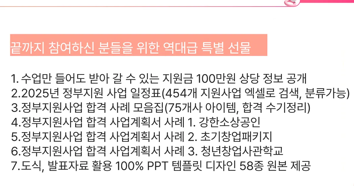 (15:44) 그래서 오늘 수업을 들으시면 수업 중간에 그냥 정보만으로도 받아갈 수 있는 100만 원 상당의 어 이런 지원금 정보를 제가 다 풀 예정이니깐요. 꼭 같이 어 함께 하시면서 받아가시면 좋을 것 같고요. 그리고 2번부터 7번까지에 대한 패키지. 네. 한 번도 이렇게 드린 적은 없는 거 같은데 오늘 들어오신 분들에 한해서 제가 역대급으로 선물을 준비를 좀 했습니다. 제가 어 올해 2025년 정부지원 정부 지원 사업 언제 나와요? 뭐 어떤 사업이 있어요? 매일 이런 걸 추천해 주고 뭐 찾고 하는데 시간 다 보내고 너무 그 그런 것들이어 비효율적이죠. 아예 엑셀로 정리했습니다.