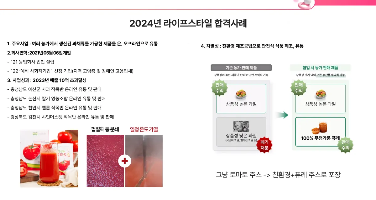 (09:54) 1억을 받았습니다, 여러분. 네. 놀랍죠? 네. 어 그래서 여기 같은 경우에는 농업 회사 법인으로 사업을 하신지 꽤 되셨고요. 이거 강한 소상공인는 여러분 연차 제한이 없어요. 뭐 뭐 10년 된 기업이든 20년 기업이든 제한이 없습니다. 누구나 지원을 하실 수가 있고 1년 차 된 기업도 합격을 하십니다. 그러니까 뭐 제한이 없다는 거 아시 아 아시면 좋겠고요. 누구나 다 됩니다. 용조합법인 협용 조합 뭐 개인 사업자 전부 다 가능하시고요. 자 여기 같은 경우에는 이제 그냥 토마토 주스가 아니라 조금 스토리를 넣었죠. 제가 이제 컨설팅을 하면서 대표님 그래도 약간 스토리텔링이 있어야 됩니다.